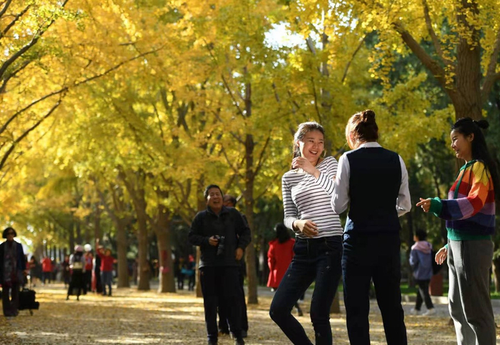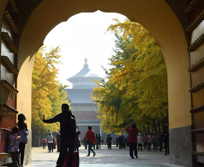天坛公园,几条银杏大道分布在不同区域。这里既有市民,又有中外游人,大家一同赏景,偶尔相互帮忙拍照,留下浓郁金秋,也定格快乐和友谊的瞬间