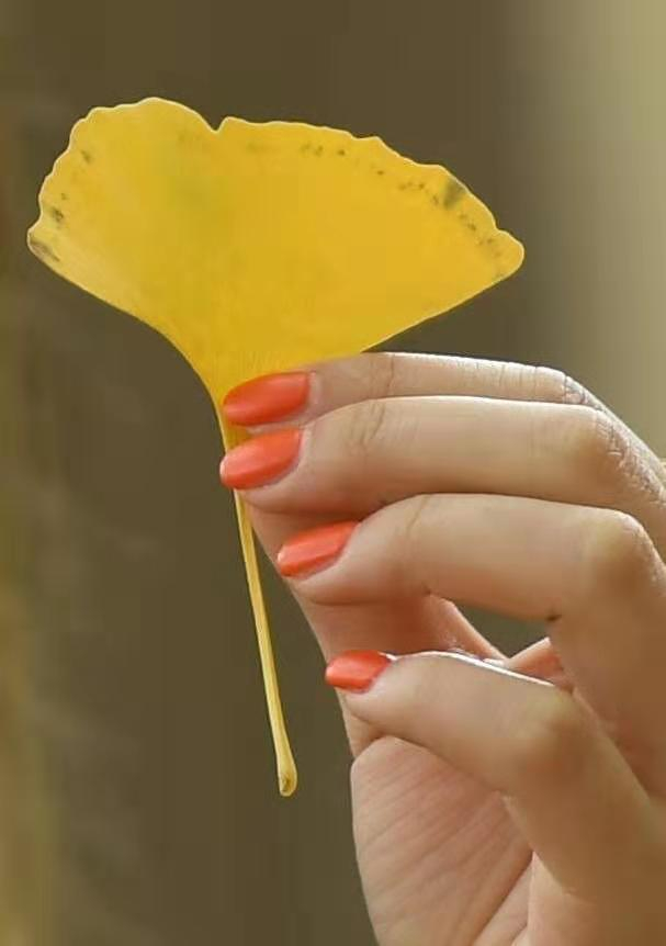 三里河路银杏林,一位女孩拾起一片落叶仔细观赏。