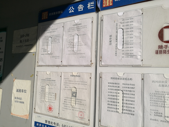 巷上嘉园小区通知栏里求租车位和出租车位信息贴在了一起