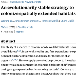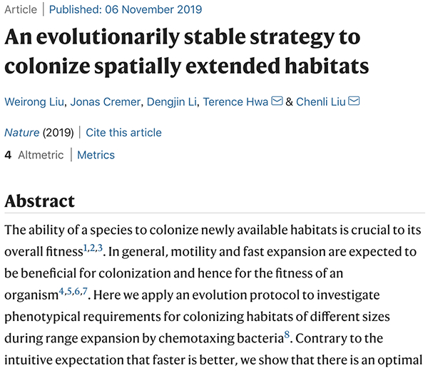 北京时间11月7日凌晨,国际顶级学术期刊《自然》(Nature)以长文形式发表了题为“An evolutionarily stable strategy to colonize spatially extended habitats”的研究论文。该论文的第一作者和最后通讯作者单位均为深圳先进院。