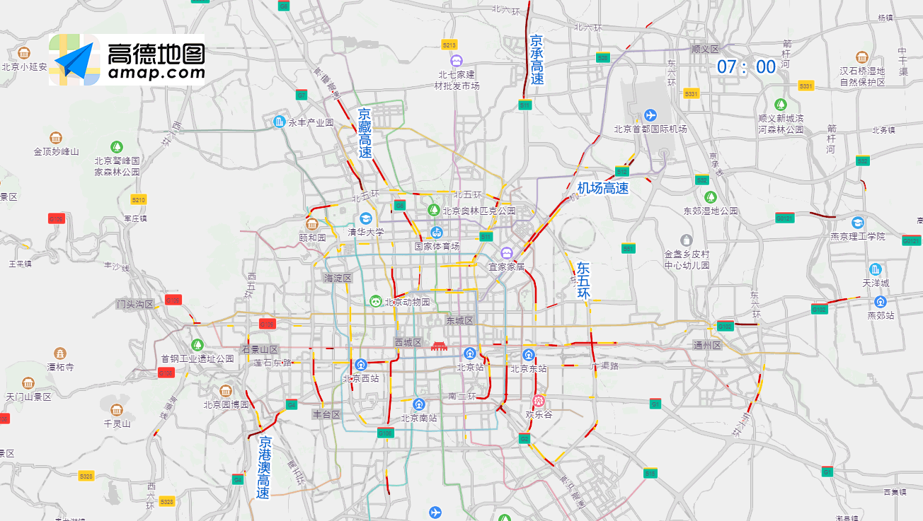 工作日早晚高峰期间,东、西、北部城区的二、三、四、五环,通惠河北路、国贸桥区、肖家河桥区、莲石路,以及京藏、京承、机场高速公路交通压力较大。早高峰交通压力最大的时间为7:30至8:00。