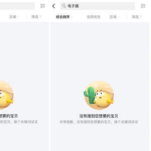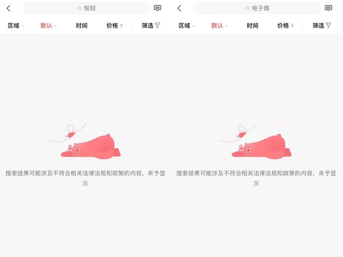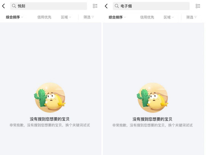 以阿里巴巴旗下二手交易平台闲鱼为例,记者在闲鱼上搜索“电子烟”、“悦刻”、“魔笛”时,发现相关关键词被屏蔽,平台显示为“没有搜到您想要的宝贝”。