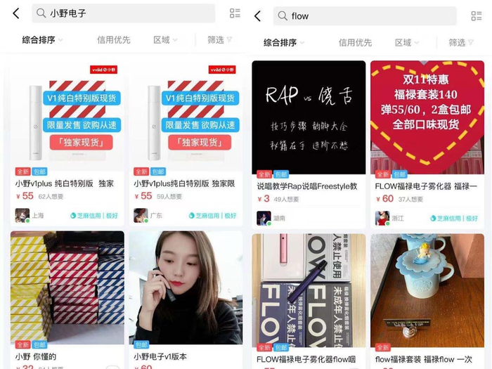 但如果将搜索关键词变为“小野电子”、“福禄Flow”、“灵犀”、“电子雾化器”,便可以看到大量全新可售的电子烟产品。