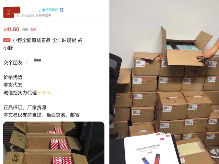 “口味都是全的,绿豆、红牛、荔枝、薄荷都有,赶着出货,批发3折起,价格优惠。”闲鱼上,有小野的代理商表示,目前库存有积压,趁还能拿货可以赶紧批发,零售也有优惠。