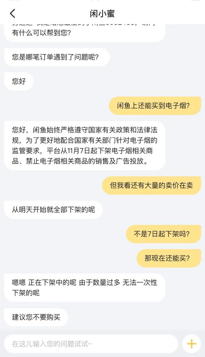 对此,记者联系闲鱼客服。客服表示,闲鱼始终严格遵守国家有关政策和法律法规,为了更好地配合国家有关部门针对电子烟的监管要求,平台从11月7日起下架电子烟相关商品、禁止电子烟相关商品的销售及广告投放。