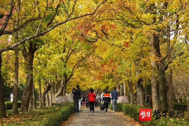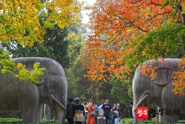 钟山风景区有四条“落叶大道”,其中最有名的就是明孝陵石象路。古老石刻间错落种植着乌桕、榉树、银杏、三角枫、枫香、黄连木等树种。各种秋叶五彩缤纷,银杏的灿黄,三角枫的火红,乌桕的艳丽,层林浸染,谱出秋天的长调。