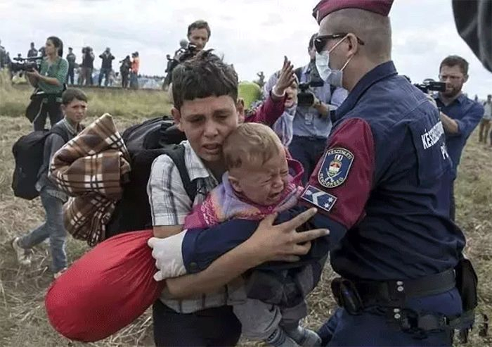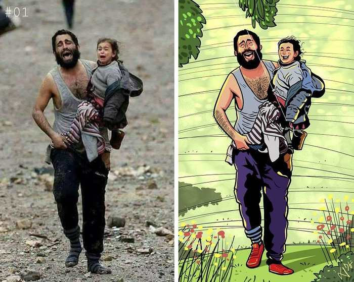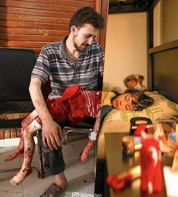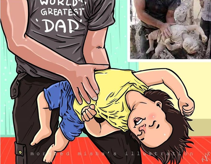 一个5岁的小女孩被压在刚遭遇空袭后的废墟中,手里仍死死抓着7个月大的妹妹的衣服,以防她掉下去。父亲匆忙赶到,看到这个画面,眼中全是悲怆。为了救妹妹,小女孩走了。不过,她一定能在天堂和同样在空袭中遇难的妈妈重逢吧。