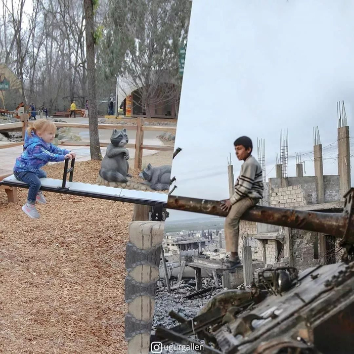 一边是公园里跷跷板上的快乐,一边是战争废墟上的荒芜。