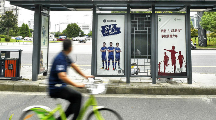 公交站台、户外广场大屏幕,到处都能看到昆山FC的元素,越来越多的市民开始讨论球队的战绩,越来越多的球迷开始主动走进球场。