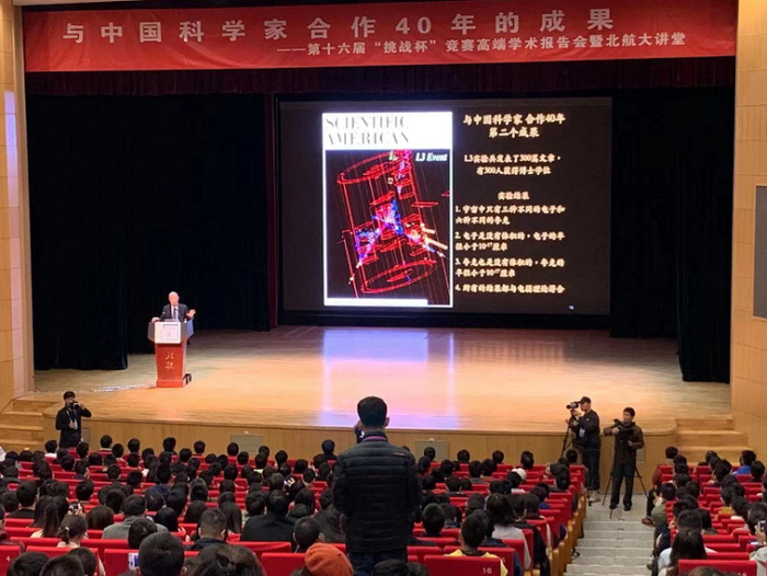 第十六届“挑战杯”全国大学生课外学术科技作品竞赛决赛即将在北京航空航天大学拉开战幕,今天(11月8日)上午,诺贝尔物理学奖获得者丁肇中先生做客“挑战杯”竞赛高端学术报告会。少有的中文报告,一个半小时的演讲,83岁的他全程站立,细细梳理了40年间与中国科学家的三大实验。