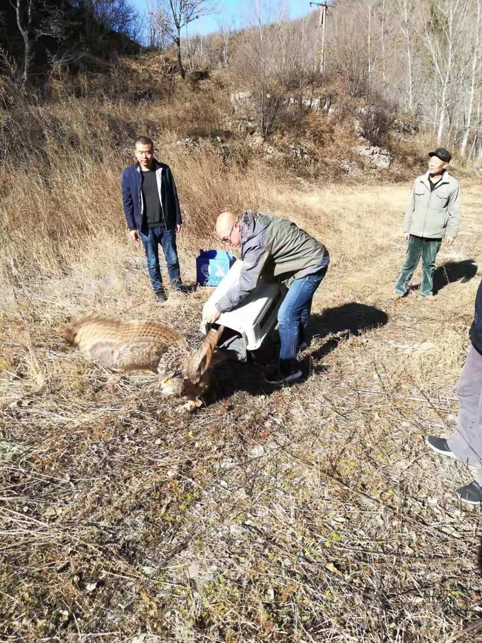 今天中午,恢复体力精力的雕鸮被工作人员在密云雾灵山放归。至于为什么不在接受地房山阎村放归,工作人员解释,雾灵山自然保护区远离村庄,而且生态环境好,有丰富的野生动植物资源,可以给雕鸮提供更理想的栖息环境。