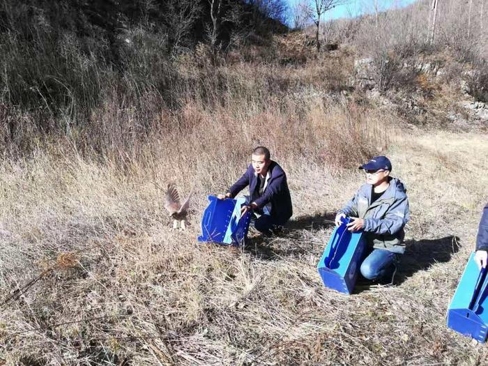 今天和雕鸮一同在雾灵山放归的还有1只燕隼、3只红隼。燕隼的接受地是石景山崂山派出所,受伤原因为撞伤,经过兽医治疗后,恢复了飞行能力。3只红隼是今年接收的亚成体,饲养长大后都达到了放归标准。
