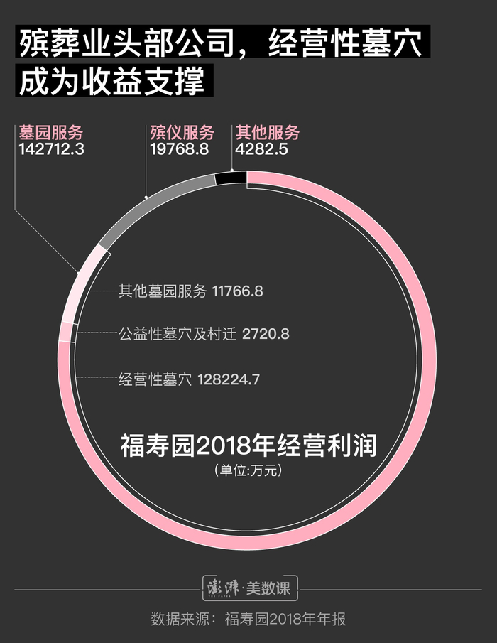 根据殡葬业头部公司财报显示,人们印象中目前殡葬业的“暴利”,实际上几乎是因为经营性墓穴的利润极高所导致的。2018年,殡葬业行业龙头福寿园与另一家综合性集团福成股份的年报显示,这两家公司经营墓地及殡葬业的收益,撑起了整个公司。