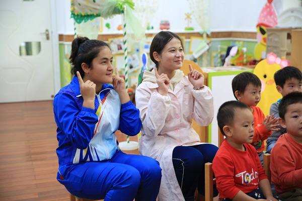 图说:喀什学生来沪与群益学生“手牵手”一起参加学前教育专业教学实习