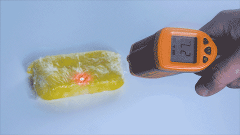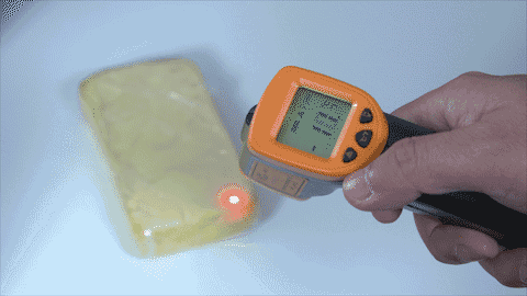 30分钟后,打开羽绒服,结果可以预知——黄油已经在余温下融化了,用黄油刀一碾就能散,用红外线温度计测的温度竟还有26度!而暴露在寒冷环境下的已经被冻硬,温度在零下12度左右。