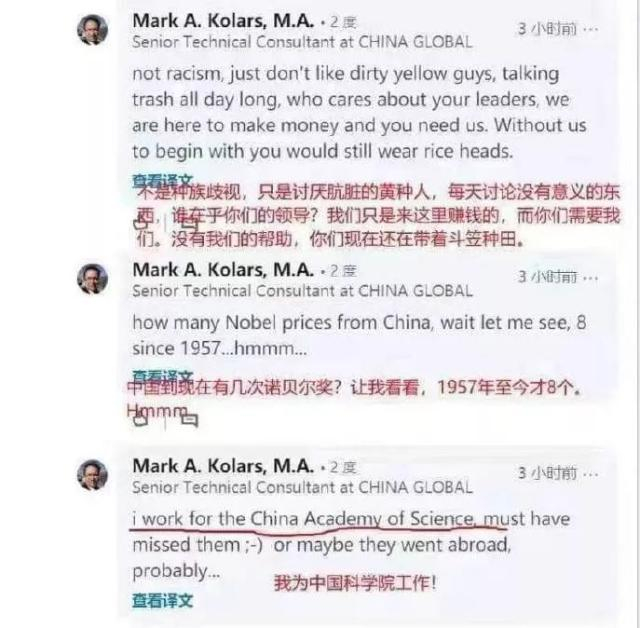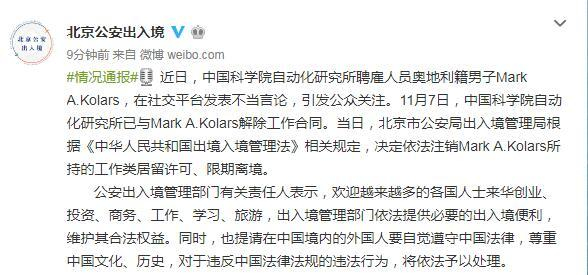 近日,中国科学院自动化研究所外籍雇员、来自奥地利的克拉尔斯(Mark A Kolars)持续在社交平台发表“辱华言论”,引发众怒。目前,北京市公安局出入境管理局根据《中华人民共和国出境入境管理法》相关规定,决定依法注销其所持的工作类居留许可、限期离境。而此前,中国科学院自动化研究所已与其解除工作合同。