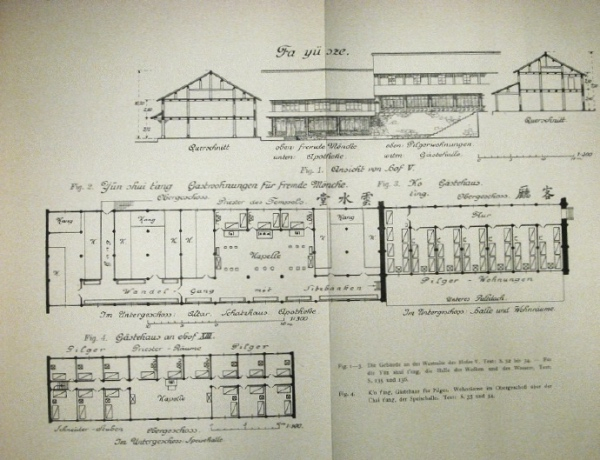 恩斯特在普陀山做了大量测绘工作,成书后附208张照片和32张插画,由此也可以看出恩斯特的详尽和细致。书中,尤其是对于法雨寺的研究和记录,细致到佛寺的陈设、构造、塑像等,无一遗漏,连佛龛佛台都有详细的记录和笔绘。法雨寺是明朝万历年间所建寺院,由高僧大智创建。据说,大智来自四川峨眉山,在普陀山礼佛时,爱上此地,决定留下。他在这里结庐,后变寺舍,最早叫“海潮庵”,后又改作“镇海寺”。该寺康熙年间大修,“法雨禅寺”之名也来自康熙,他还特设一块匾额,御笔亲书“天花法雨”,如今依旧悬挂在法雨寺的大殿正门之上。