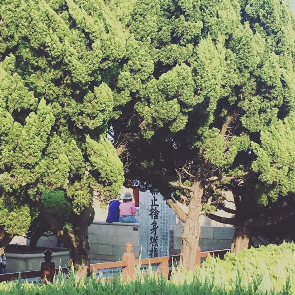 法雨寺古朴清幽,一如匾额上康熙的书法,拙朴仓遒。我一开始以为法雨寺比普济寺历史悠久,实际上,普济寺虽始建于宋朝,但后世屡遭毁坏,也在康熙28年时重建,时间和法雨寺一样。据说康熙受到观音大士点化,决定划拨钱款,兴建佛寺。另在其南巡杭州期间,两寺的住持也陪伴皇上左右,“感化”他将款项花在建造普陀山的寺庙上。