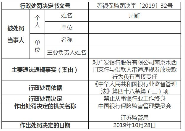 11月6日,江苏银保监局连续发布4条处罚信息公开表,原广发银行南京分行水西门支行女行长周群,因与借款人串通违规发放贷款行为,遭到银保监局“禁止从事银行业工作终身”的行政顶格处罚,另有该行三名前员工也被禁业5年。