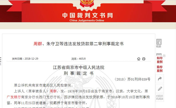 周群被罚的原因是“对广发银行南京水西门支行与借款人串通违规发放贷款行为负有直接责任”,据记者从裁判文书网了解到,这位女行长给自己的前夫违规放贷超亿元,其中贷款本金总计7600余万元未收回,不仅自己锒铛入狱,还牵连该行朱守卫、牛鑫和胡立文三名员工遭受牢狱之灾。