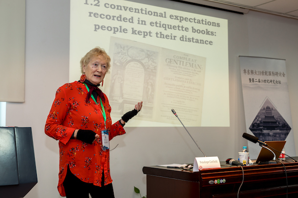 欧洲科学院院士Penelope Corfield在演讲中回顾了她二十年来对“脱帽礼”等早期现代日常交往礼仪的嬗变的研究。她首先指出,人们的日常礼仪很少留下书面的记载描述。尽管各色礼仪手册为社会交往制定规范,但并不能代表日常生活的真实面貌。所幸,我们可以在书信、日记、戏剧、游记和绘画中找到许多相关证据,并结合制帽业和帽子形状的演变,艰难构建出日常问候礼仪发生变化的缓慢历程。从18世纪开始,传统的问候方式逐渐式微,男性的行礼方式从深鞠躬逐渐变成点头与以手触额,而女性的深屈膝礼则演变成简易的浅蹲。同时,一种全新的问候风格悄然兴起,昭示平等和互信的握手礼在商业合作和人际交往中迅速普及。握手成为新的外交规范、商业合作、同阶层人士间友谊、社团忠诚等现代社会关系的标志,书籍中和建筑上经常出现握手的装饰图案,绘画作品(如1769年油画《布拉德肖家族》)中也偶然能找到对于握手礼节的记载。简·奥斯汀小说中的细节说明握手礼开始出现在男女之间,社会中下阶层也在同时受到日常问候礼节变化的影响。不过,即使在1830年的美国,跨阶级、跨种族人群之间的握手仍然很少,说明民主平等观念的到来与其实践之间存在着巨大的鸿沟。最后,Corfield教授指出,她并非主张以日常礼仪的变化为征兆彰显西方社会的“进步性”,她深刻理解全球文化演变的多元路径。