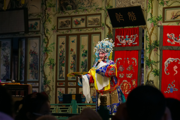 按照戏楼建设情况,传统戏楼可以分为三种形式:宫廷戏楼、会馆戏楼和民宅戏楼。恭王府戏楼是典型的中国传统大戏楼。戏楼全部用木头建造,不用一枚铆钉,多年来从未漏过一滴雨,这在北方非常少见。在舞台下面埋了九口大水缸可以充分帮助声音传送。所以不用任何音响装置,台下不管坐在哪个位置,都能清晰听到,且越靠后,声音越清晰。而同时期戏曲演出场所多为分体式建筑,例如颐和园的德和园大戏楼。