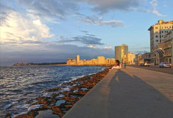 Malecon的海水激荡着海岸,我继续用我不熟练的西班牙语问着他一些信息,他切换着中文,英语,西班牙语认真尽力地回答着我的问题。傍晚夕阳西下,从远处海天交接的地方到近在咫尺的脚下,每一朵浪花都带着落日的余晖乘着微凉的海风在自由的舞蹈,我逐渐感受到了聪跟我提到的哈瓦那每一寸土地的各异和每一种内容带给人的自由感觉。夕阳西下,我的心也沉浸在哈瓦那的夜色里。