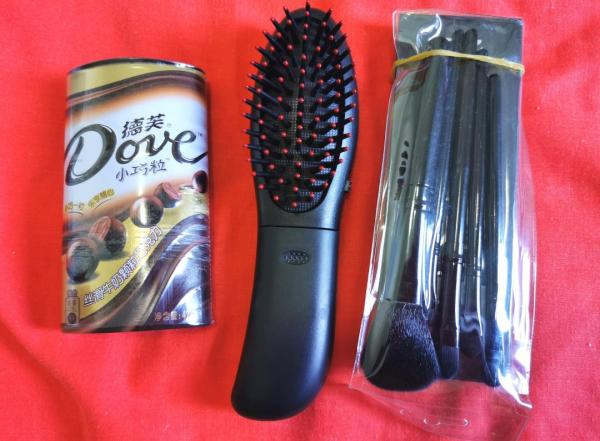 Odelyn的一盒德芙巧克力,一小套化妆刷一块电子手表和装电池的电动梳子