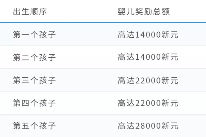 从2015年开始,在新加坡生孩子的奖励金由之前的6000新元提高到了8000新元(约41500人民币),加上给新生儿的其他补助,生第一个孩子的奖励总额已达到14000新元(72500人民币)。