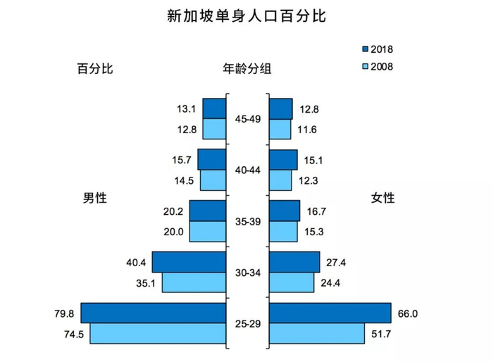 但是目前来看,尽管有这么多努力,新加坡人还是越来越不愿意结婚。据统计,2008年,在25-29岁的新加坡人口中,一半的女性是单身,四分之三的男性是单身。十年过后,这一数据分别升到了三分之二、五分之四。