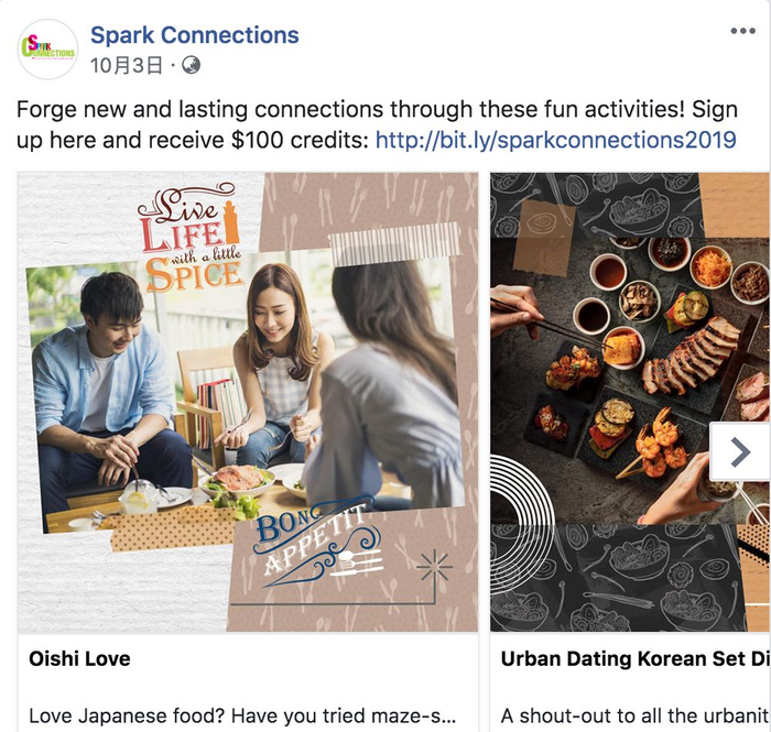 每年两次,SDN联合这些私人机构,推出声势浩大的“火花连接”(spark connection)约会活动,比如“2个比1个好,威士忌单身之夜”、“做我的诱饵吧”(是一种外出捕虾活动)等等。只要来注册参加,就能获得100新元(约520人民币)的奖励金。