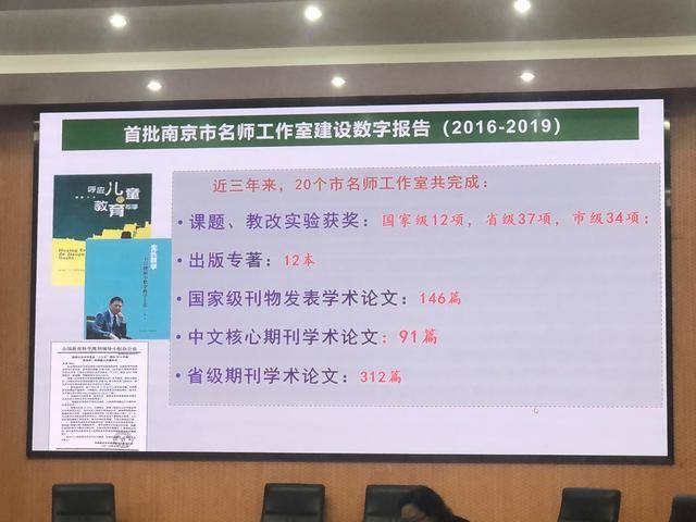 据数据显示,至2018年底,首批20家南京市名师工作室圆满完成三年一届的任期工作,首批工作室共培养正高级教师17人,江苏省学科特级教师16人,南京市学科带头人37人,南京市优秀青年教师36人;荣获国家级课题、教改实验获奖共计12项,省级37项,市级34项。首批工作室共出版专著12本,在全国性教育教学刊物发表学术论文458篇,其中中文核心刊物发表共91篇。20个“工作室”在三年时间内开展了数百次义务支教帮扶活动;承担国家级培训活动26次,省级81次,市级122次,区级174次;录制了数百节“名师优质课”,其中“送教下乡”、“名师讲堂”等活动受到教师、家长、学生的一致好评。