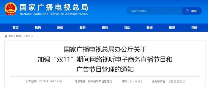 针对直播带货乱象,国家广播电视总局在11月1日发布《国家广播电视总局办公厅关于加强“双11”期间网络视听电子商务直播节目和广告节目管理的通知》,要求进一步加强网络视听电子商务直播节目和广告节目管理,节目中不得包含低俗、庸俗、媚俗的情节或镜头,严禁丑闻劣迹者发声出镜。网络视听电子商务直播节目和广告节目用语要文明、规范,不得夸大其辞,不得欺诈和误导消费者。