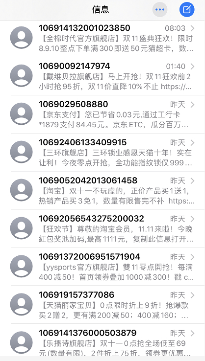 “特别是这几年,‘双11’的促销短信越来越疯狂。”望着手机里弹出的一条条短信,消费者孙阳无奈吐槽。进入十月份以来,自己手机上的各类促销短信就开始多了起来。“尤其是从十月底到现在,几乎每天都能收到几十条促销消息,有些是商家自己发的,有些是电商平台发的,各种产品都有。”对于促销短信的来源,孙阳坦言大部分都是曾经网购过的商家,也有个别是线下实体店发送而来的。