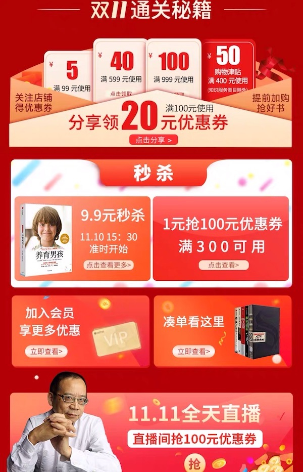 在这些热闹的营销套路之下,能够完全不受影响的用户少之又少,冲动下单、大额下单的读者在“双十一”,甚至在每次“书香节”、“图书满减”期间,都会成倍增加。而在这一场场营销盛会之下,那些会被书店老板精挑细选、如获珍宝般搬回家屯着的库存书,未必有一席之地,出版人心中心心念念的“滞销”好书,也没能获得用户更多的注意力。