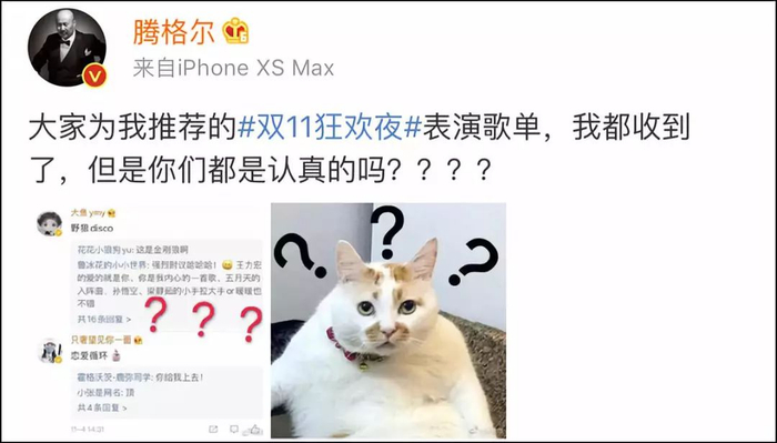 待这位“草原蹦迪气氛组组长”将要在天猫双十一晚会上演出的消息公布后,网友们又激动了——腾格尔老师这回又要“祸害”,哦不是,又要翻唱什么神曲了!
