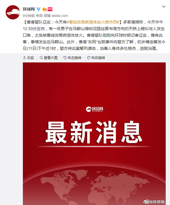 多家港媒称,今天中午12:50分左右,有一名男子在马鞍山海柏花园往图书馆方向的天桥上疑似与人发生口角,之后被暴徒泼易燃液体放火。香港警队刚刚向环球时报记者证实,确有此事,事情发生在马鞍山。此外,香港“东网”也就事件向警方了解,初步确定事发今日(11日)下午近1时,警方将此案暂列袭击,当事人身体多处烧伤,送院治理。