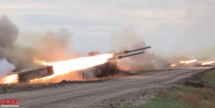 参演俄军“飓风”远火齐射火箭弹瞬间。
