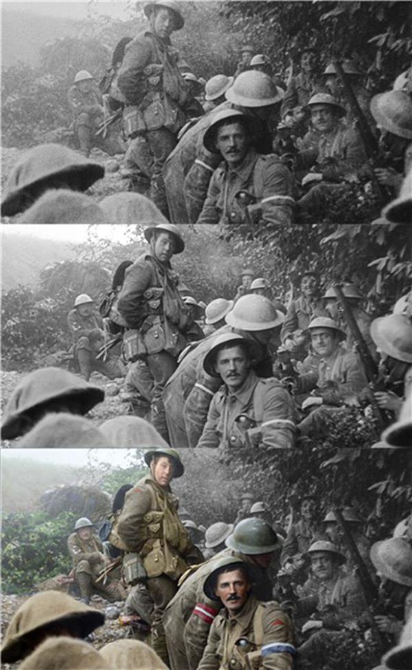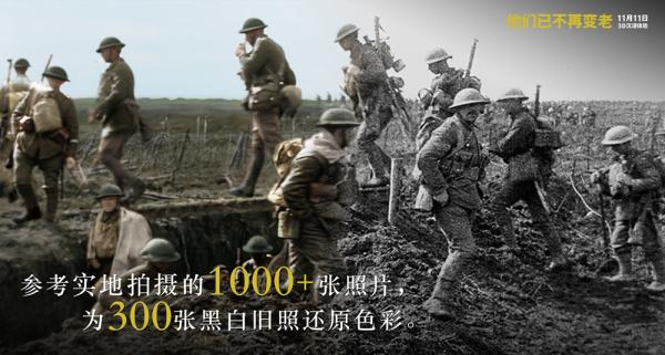 在《魂断蓝桥》《西线无战事》等影片中,世人已经在脑海中将一战时的景象定义为黑白色调,仿佛那时的天空、田野和士兵的脸孔都没有色彩。毋庸置疑,将纪录素材彩色化在过去对电影制作人来说肯定是一个棘手的问题。彼得·杰克逊却不以为然,“在第一次世界大战中,西部前线的摄影师别无选择,只能黑白拍摄——他们并没有彩色胶卷。”来自Stereo D的数百名艺术家参与到此次摄制最艰难的着色阶段。为了让老胶片的颜色既还原真实又清晰自然,彼得∙杰克逊亲自探访一战实地,拍摄了1000多张照片用来为场景上色作参考。同时每位士兵的军装、徽章、小物件等一切细节都要复原成最真实的色彩,团队用一战遗留的制服实物进行比对,共调制近4000种颜色,进行无数次尝试最终才呈现出最具真实感的历史画面。