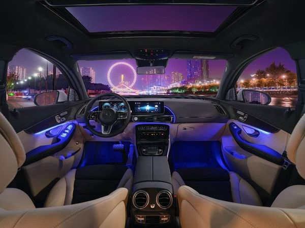 其内饰也与外形的“先锋豪华”风格保持了一致,如仪表台边缘的纹路设计、形似高保真音响功放的散热片等。在驾驶舱方面,它延续了典型的梅赛德斯-奔驰翼板轮廓,为不对称设计,并偏向驾驶员。形状扁平,具未来设计感的空调出风口则被安置在充满科技感的垂瀑式中控面板上,并以钥匙形玫瑰金色饰条装饰。它们是EQ新颖设计理念的一大特色,也是这一新车型的专属。双10.25英寸的仪表盘和中央触摸屏位于一个共享的玻璃曲面后方,形成一个大尺寸独立式屏幕,支持CarPlay和Carlife智能手机互联服务,并在储物盒中设置了无线充电功能。中控台的触摸板则提供了另一种方式来控制诸多车辆功能。标配的64色环境氛围照明系统的仪表板照明效果令人难忘,并带有多达10种的车内氛围主题。带有车型专属字样的带照明功能迎宾踏板也是标准配置。