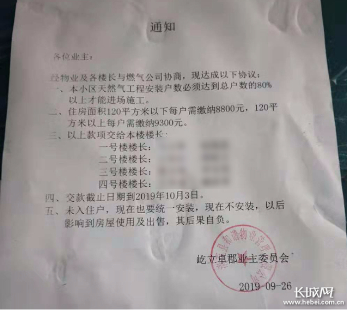 屹立卓郡小区强制向业主收取天然气安装费的通知。网友供图