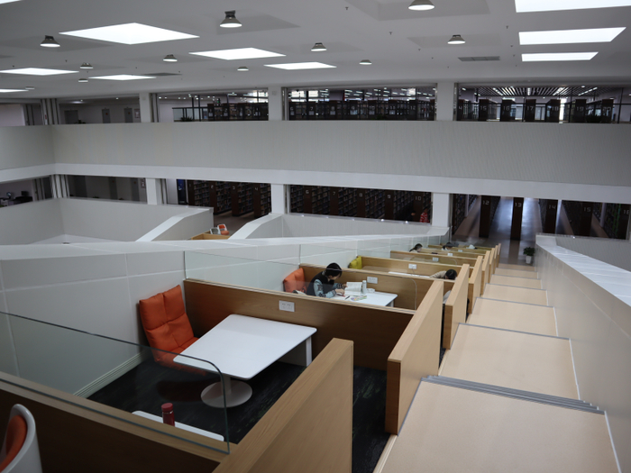 从3层往上,是图书阅览区域。在棕色的书架旁,一排排相同颜色的阅览桌椅邻窗放置,每个座位上都配备有带USB接口的多功能插座、可调节亮度的护目灯,对桌之间还设置了磨砂格挡,为读者提供了私密性。每层楼都设置有几处隔音电话亭,学生能在里面打电话、背英语,不会影响到其他人。