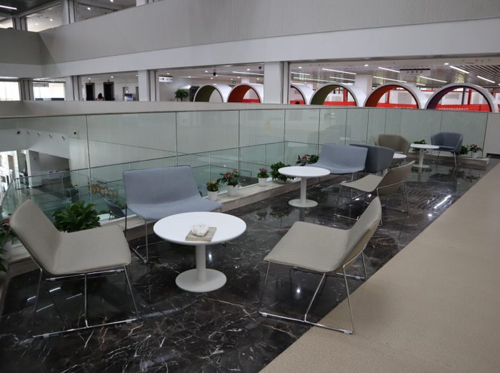 新图书馆内呈中空式布局,抬头看去,屋顶天窗将自然光线引入室内,中庭上方的3处空中斜连廊给图书馆增添了层次感。斜连廊里的空间也被巧妙利用,每一阶都设置了榻榻米式座椅,并在地面上铺了软垫。在椅子上坐累了,很多学生便来到这处“空中楼台”躺着看书,或是小憩一下。通过中庭的大斜梯走上二层的学习空间,多种颜色的圆拱形桌椅、带有蓝色围挡的双人自习座位,给灰白色调的建筑空间带来了不少活力。