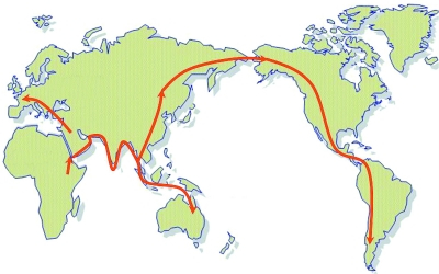 约4.5万年前进入欧洲 约10万-7万年前走出非洲 约2万-1.5万年前进入北美洲 约5万年前到达澳大利亚 约1.5万年前到达南美洲 早期现代人的迁徙路线示意图。