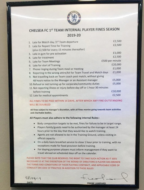 比如兰帕德规定,球队用餐或者会议期间手机响起,罚款1000英镑;比赛日或者出征客场穿错衣服,又是1000英镑。甚至于体检和治疗迟到也要罚钱。