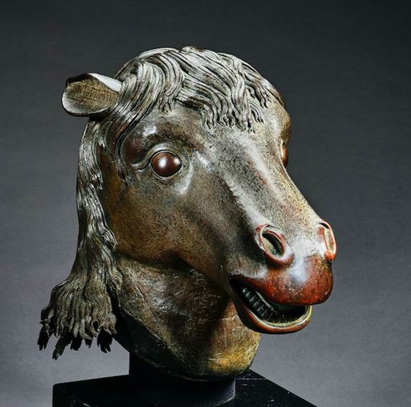 园明园马首铜像为意大利人郎世宁设计,清乾隆年间由宫廷匠师精工制作,融合东西方艺术风格,是一件非凡的中国古代艺术品。马首以分铸法、失蜡法和铆接工艺等多种技法制作,神态栩栩如生,毛发分毫毕现。马首材质为精炼红铜,色彩深沉厚重,历数百年风雨而不锈蚀。1860年英法联军侵入北京,圆明园惨遭劫掠并遭焚毁,圆明园马首铜像与其他11尊兽首铜像同流失海外。