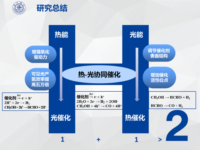 针对这一奇特现象,胡云行、方思远等提出了一种氧化驱动力补偿理论。研究发现,当紫外光被吸收时,电子可以直接从价带跃迁到导带,将质子还原,产生氢气,同时牺牲剂甲醇被氧化,甲醇氧化的氧化驱动力为2.78 eV。当可见光被吸收时,电子只能从中间能态跃迁,此时提供的氧化驱动力仅为0.88 eV,不足以驱动甲醇氧化半反应的进行。因此,他们认为,氧化驱动力不足是该反应在可见光下无法有效进行的原因。所以,他们设想,热能的引入可以增强甲醇分子的动能,补偿势能驱动力的不足,实现可见光下的高效产氢。并以此为理论基础,自主设计了实验装置,开展了有效的实验验证。