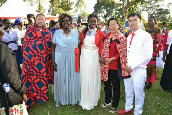 这是双方家长在婚礼上见面。我也不知道什么时候会举办正式婚礼,而且我的家人根本理解不了他们这的种婚礼文化,所以我就把它暂且作为正式婚礼来办,邀请了我在肯尼亚的华人同事和朋友,帮爸妈订了机票,让他们也一起热闹热闹,见证一下我们的跨国婚姻。