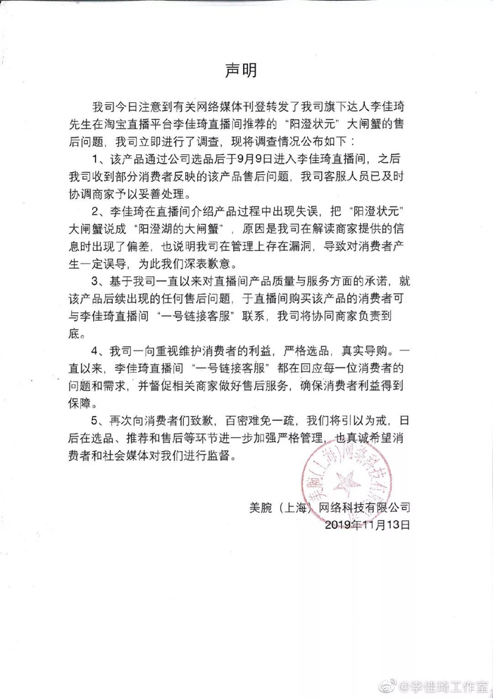 11月13日下午5点48分,李佳琦工作室官方微博发布声明回应虚假宣传风波。