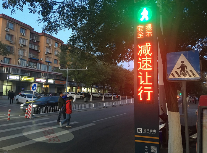 面向行车道的一侧有一扇LED屏,时而显示绿色的“礼让行人”,时而显示红色的“减速让行”。